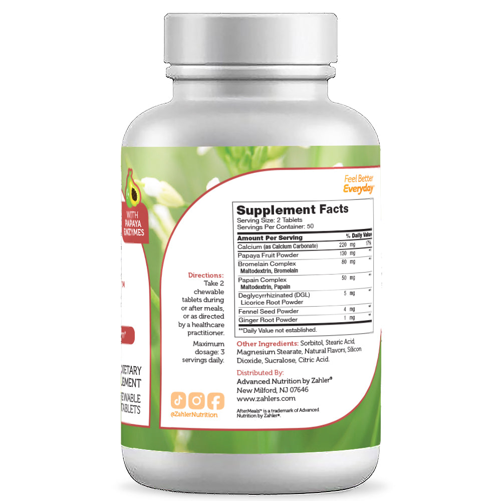 AfterMeals is a delicious-tasting chewable tablet containing calcium and digestive enzymes and is designed to promote healthy digestion.
