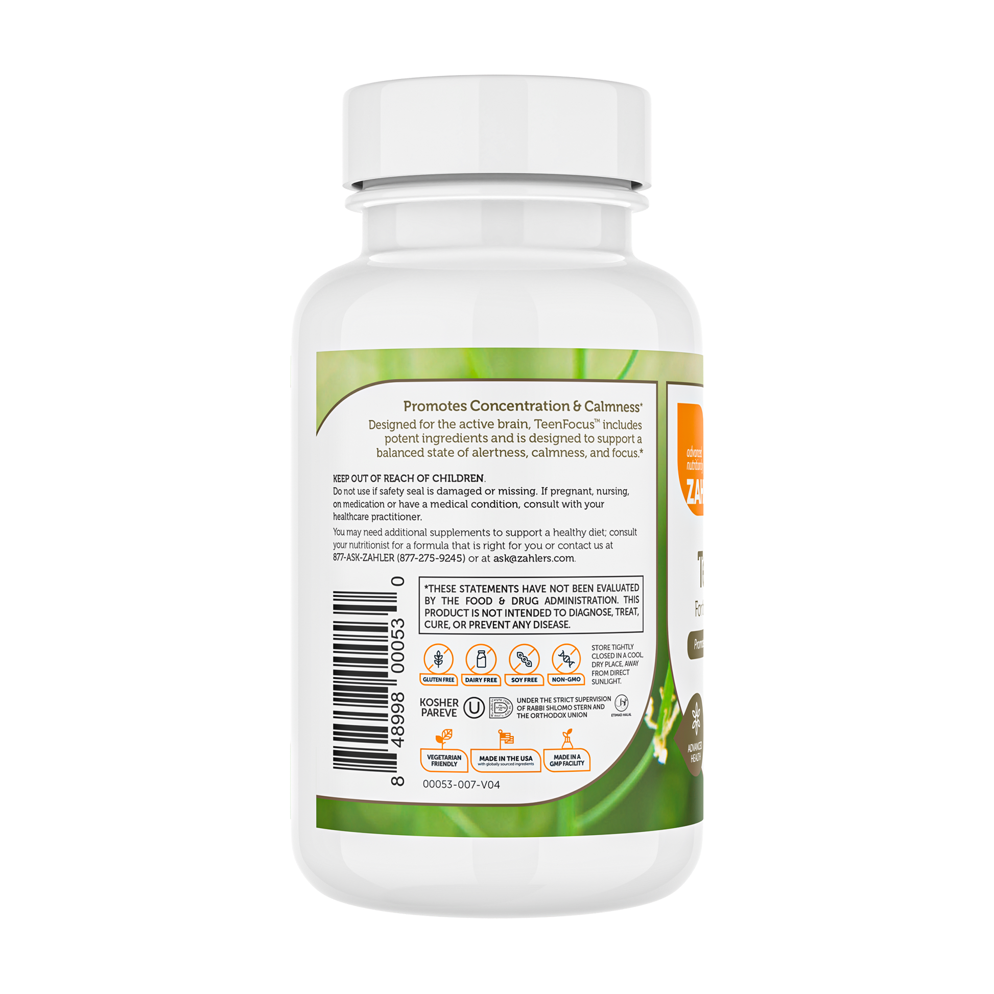 TeenFocus by Advanced Nutrition by Zahler is a unique supplement designed to provide teenagers with the nutrients and herbs most beneficial for their brains. In addition to supporting brain function and concentration, TeenFocus also helps support a calm and positive mood. TeenFocus is formulated to help teens reach their potential. By combining these ingredients, they’ll receive a powerful boost which can help them focus and concentrate on essential life lessons and education.