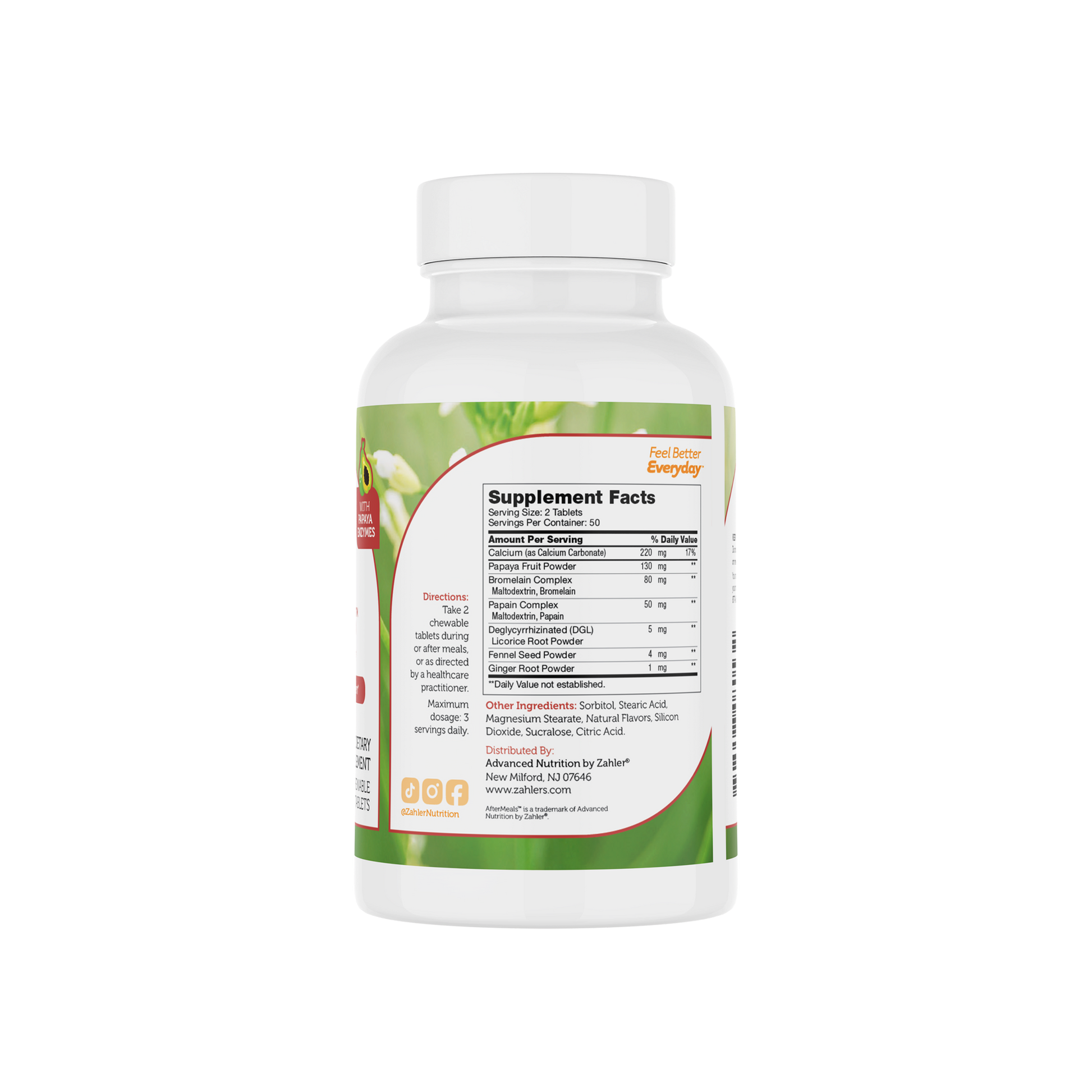 AfterMeals is a delicious-tasting chewable tablet containing calcium and digestive enzymes and is designed to promote healthy digestion.