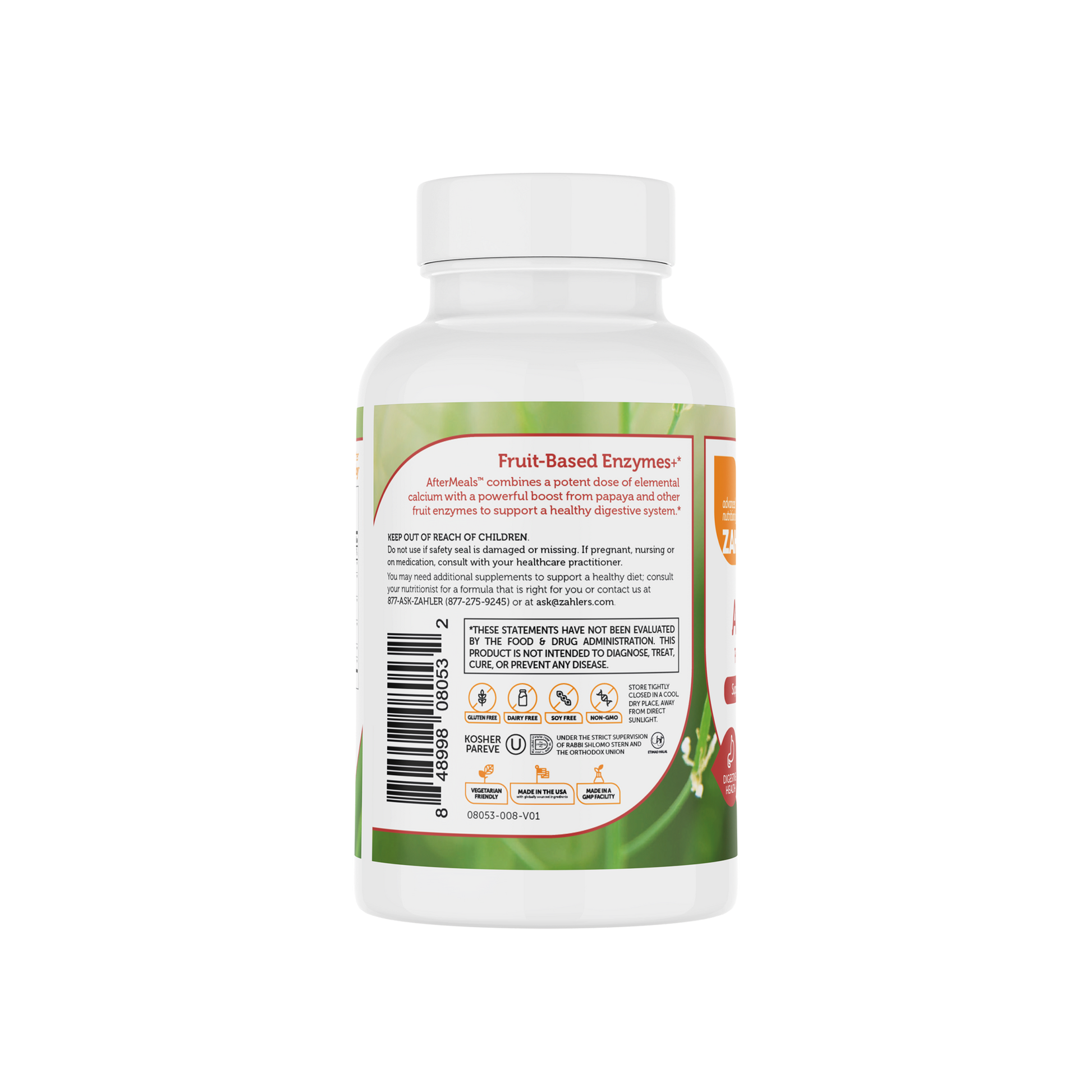 AfterMeals combines a potent dose of elemental calcium with a powerful boost of digestive enzymes derived from fruit. These ingredients, including Papaya, Bromelain and more, may help the body neutralize acids and break down food efficiently throughout each stage of digestion.