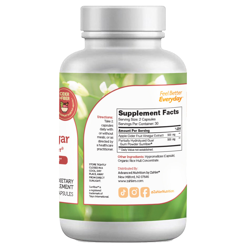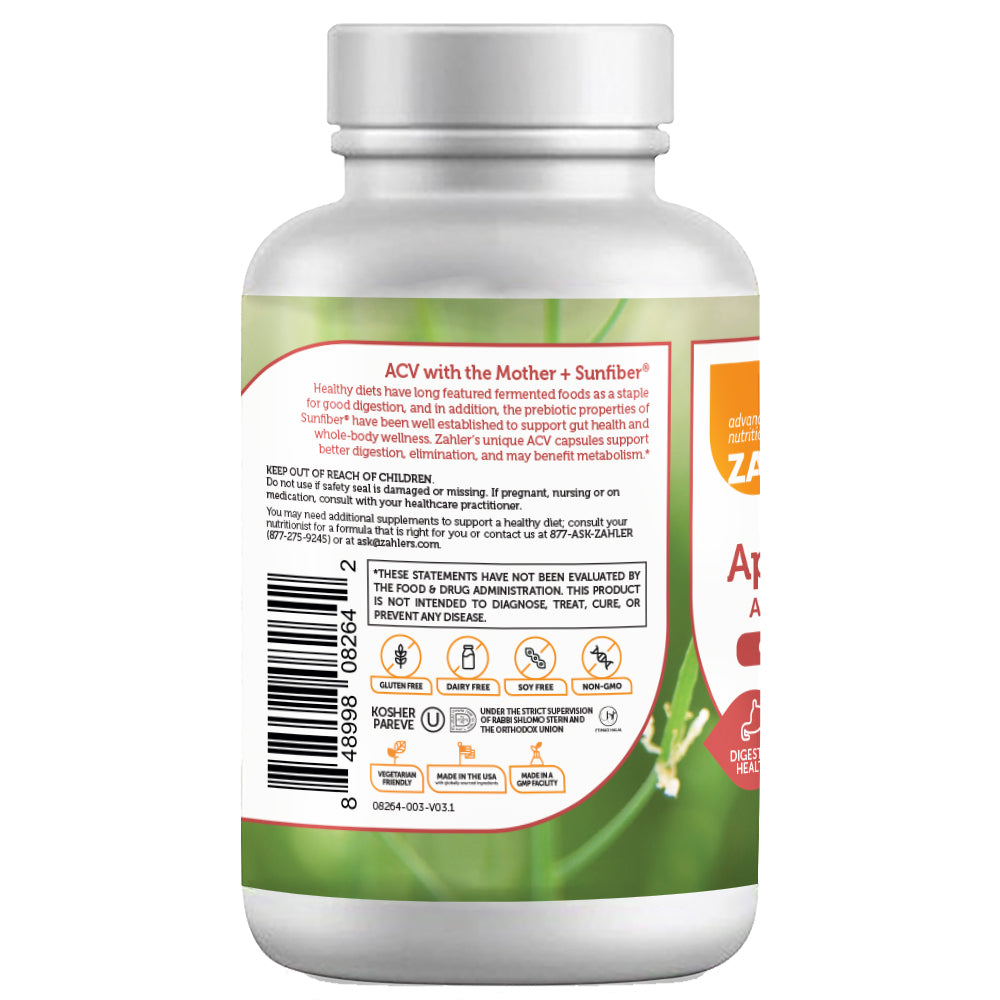 Zahler's Apple Cider Vinegar is a potent and unique combination of Apple Cider Vinegar and Fiber to provide prebiotics and fermented food for digestive health support. The prebiotic properties of Sunfiber® have been well established to support gut health as well as whole-body wellness beyond the digestive tract.