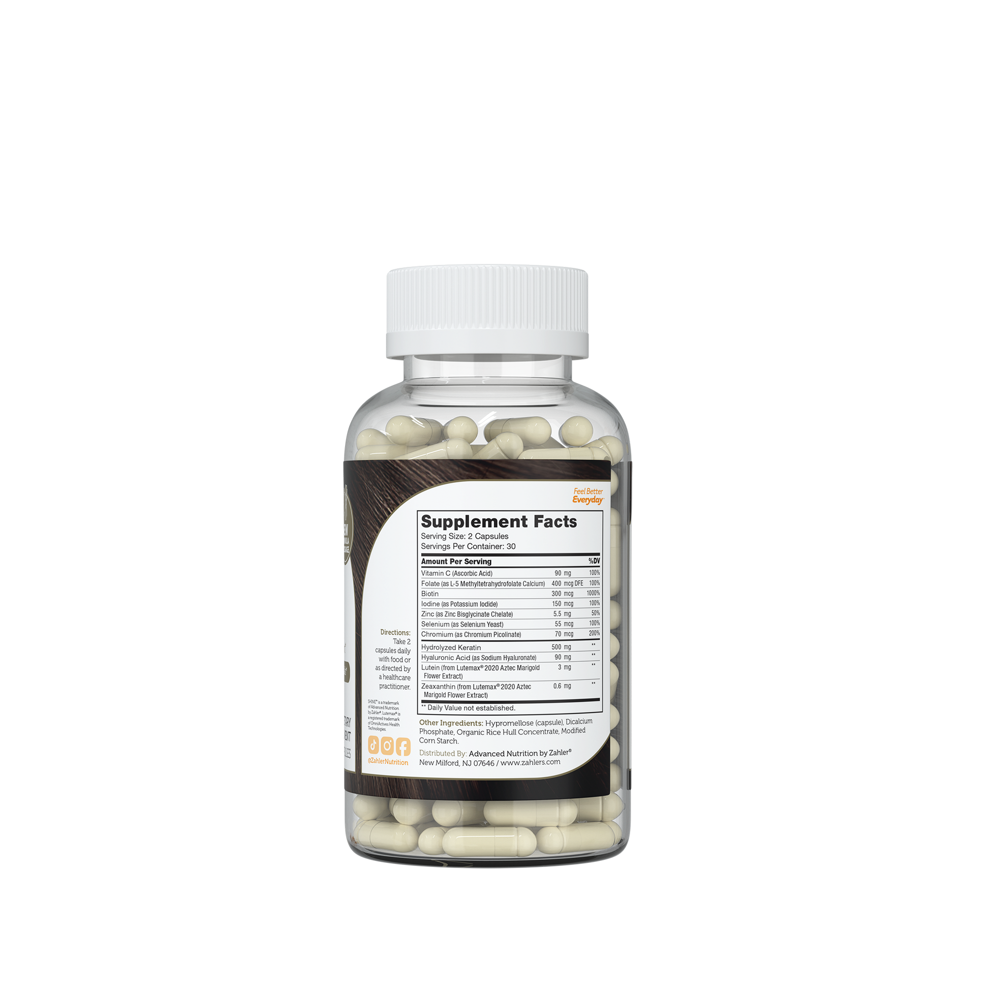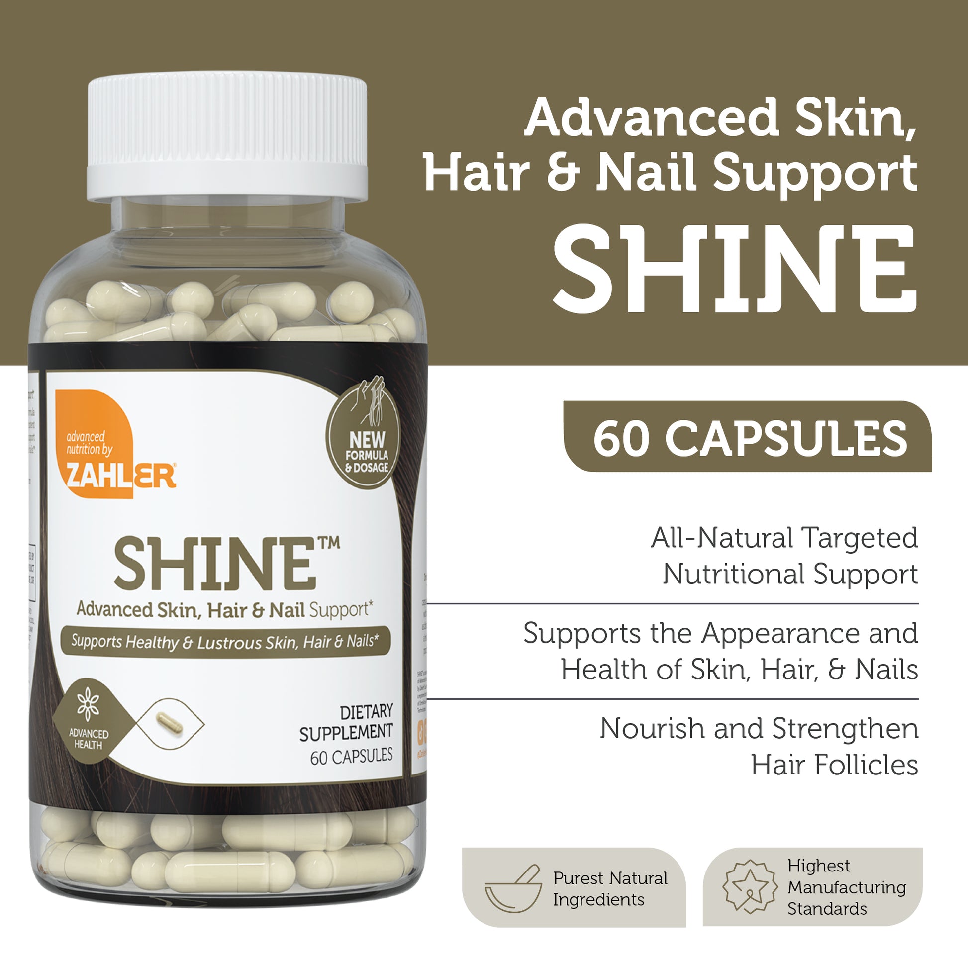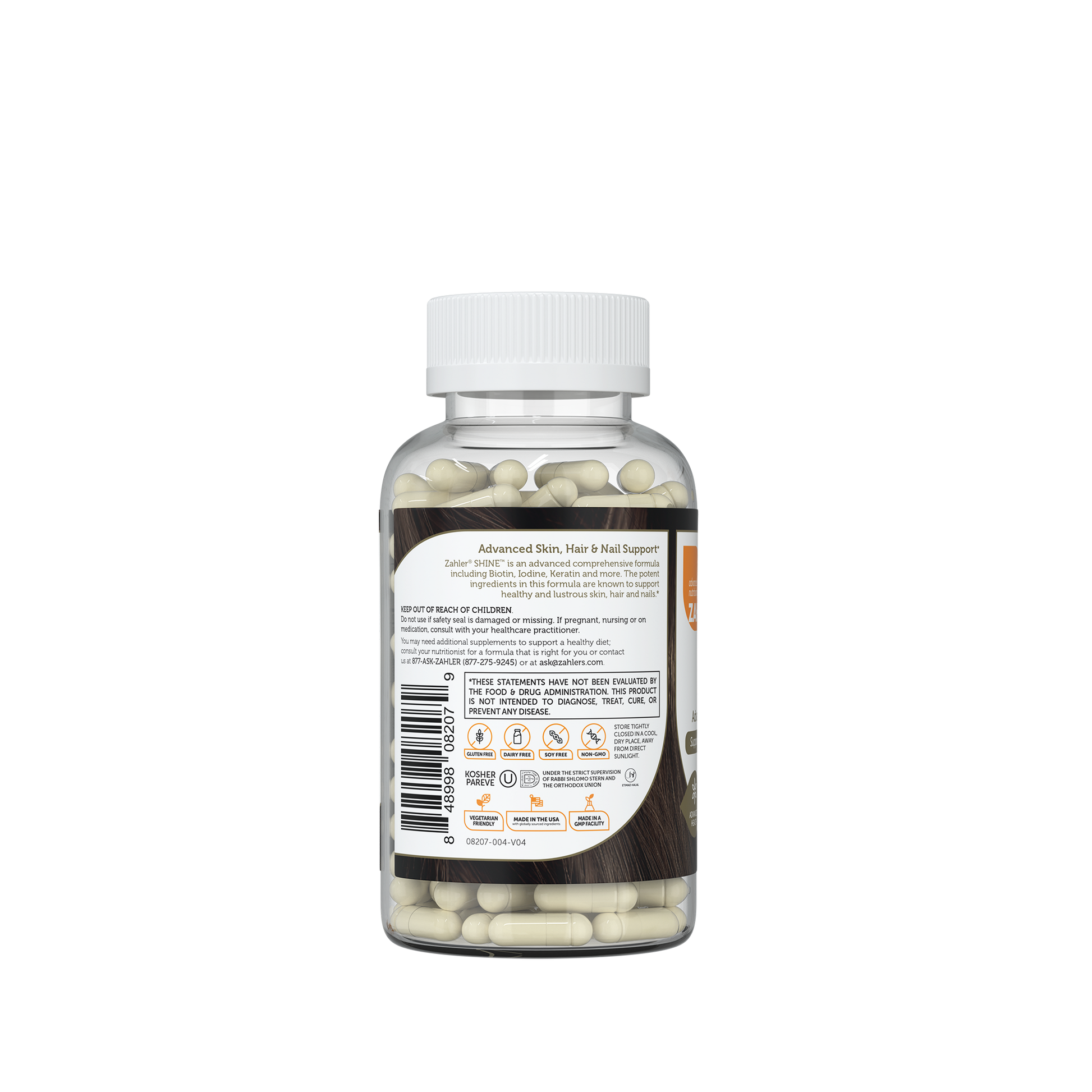 Zahler SHINE is an advanced comprehensive formula including Biotin, Keratin, Lutein and more. The potent ingredients in this formula are designed to support a healthy you, both inside and out, especially supporting healthy and lustrous skin, hair and nails.