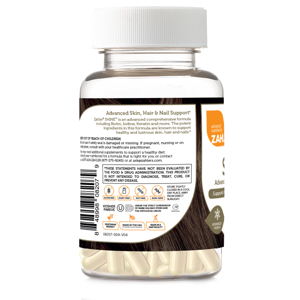 Zahler SHINE is an advanced comprehensive formula including Biotin, Keratin, Lutein and more. The potent ingredients in this formula are designed to support a healthy you, both inside and out, especially supporting healthy and lustrous skin, hair and nails.