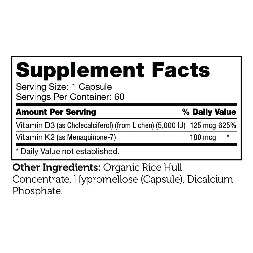 Vitamin D3 (Cholecalciferol) and Vitamin K2 (Menaquinone) work synergistically to help maintain bone health. Both Vitamins D3 and K2 provide essential support for a healthy heart, strong bones and a robust immune system.