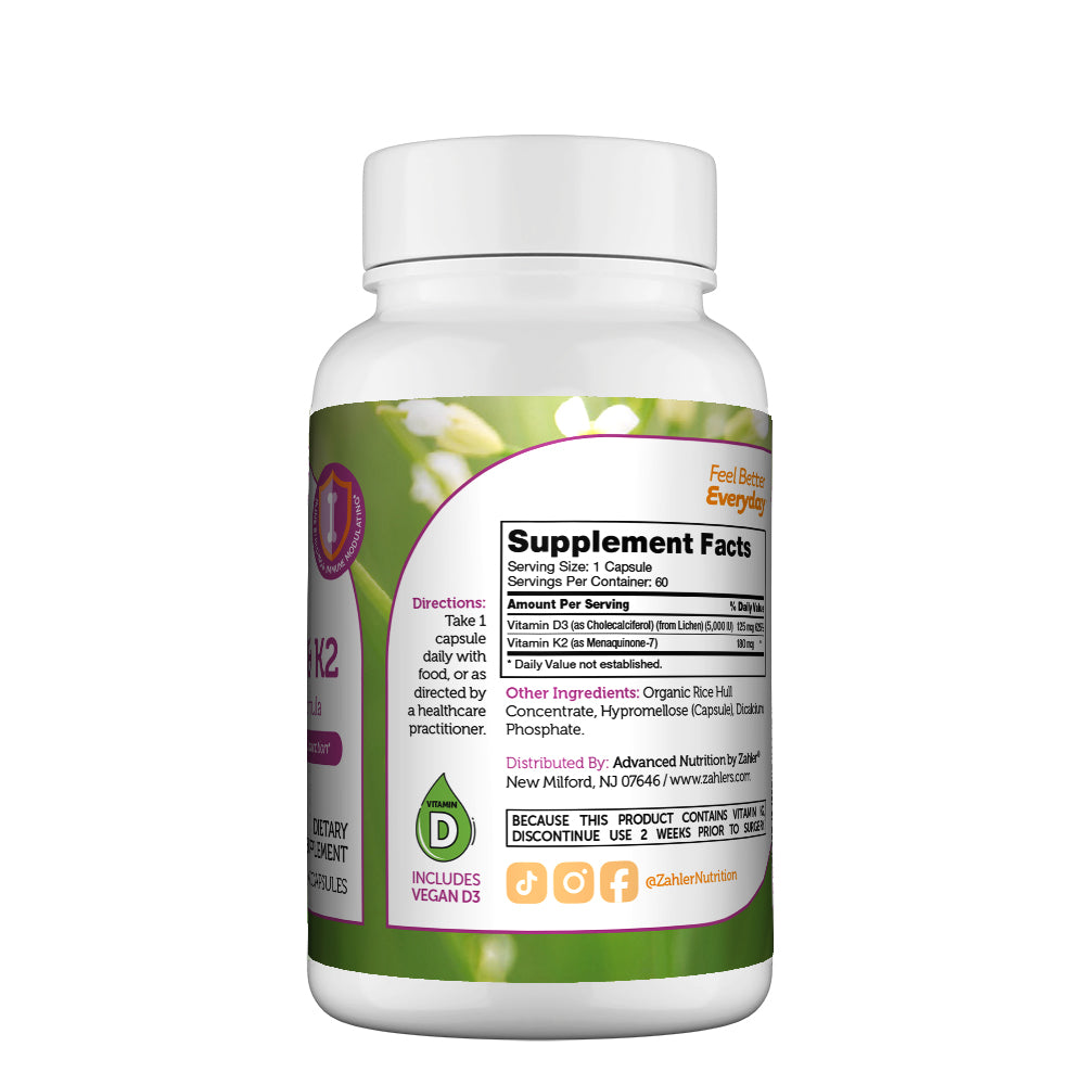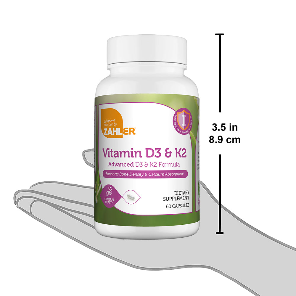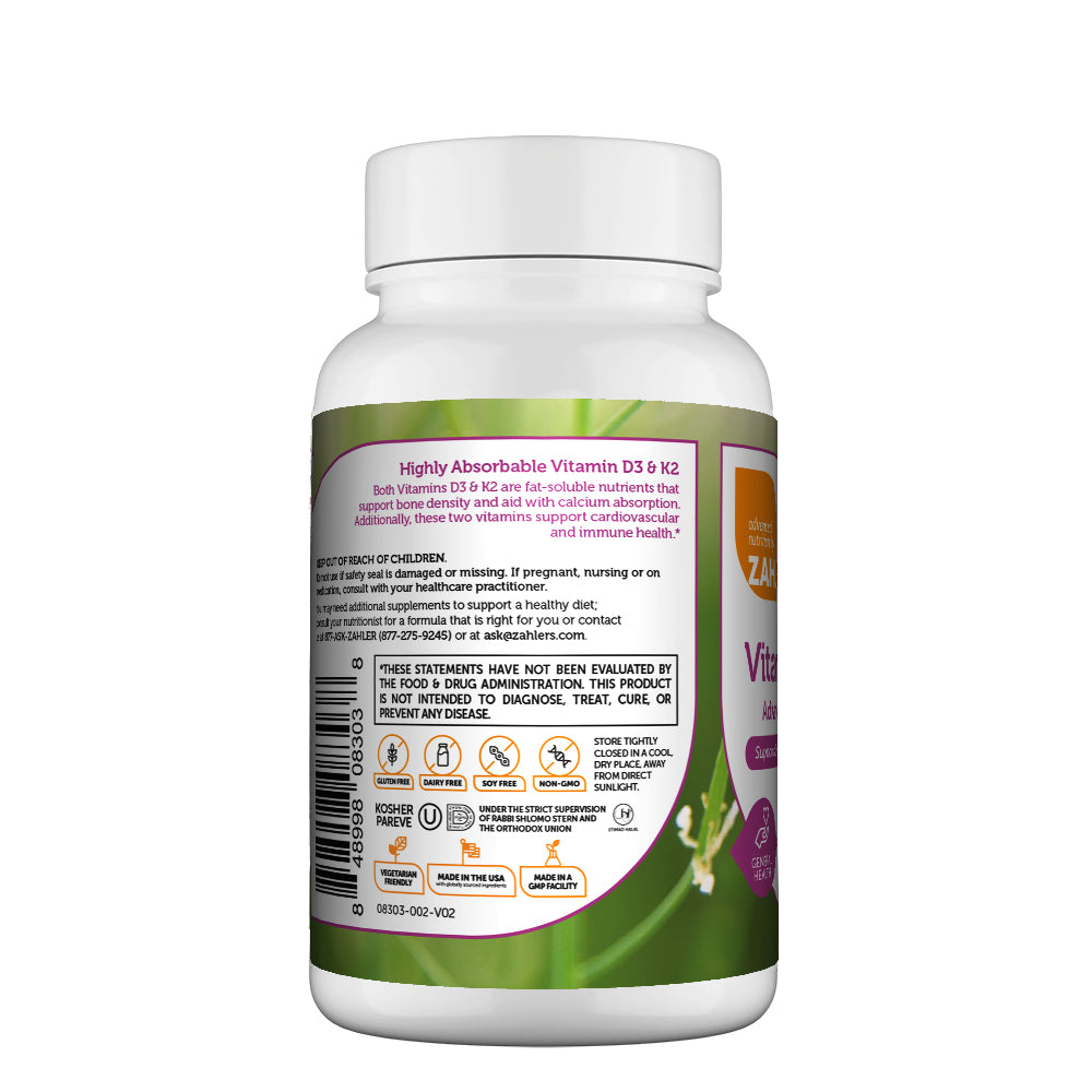Zahler's Vitamin D3 & K2 capsules provides a potent dose of these two essential fat-soluble vitamins in an easy-to-swallow capsule. This high-quality formula is designed to promote and support bone health and immunity, as well as overall wellness.